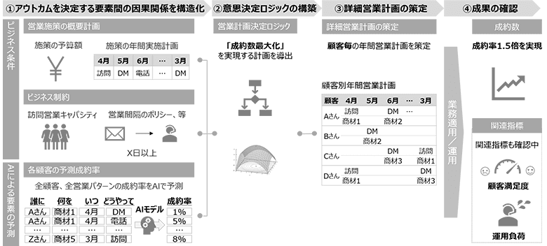 そこでDecision Intelligence活用によってビジネス条件をあらかじめ考慮し、全体の成約数最大化を目指しました。どの顧客に、何月に、どの商材を、どの手段で営業するか顧客単位の詳細営業計画を作成し、実行するシステム構築に着手したのです。Decision Intelligenceの活用による全体最適な営業計画の導出手順をご説明します。