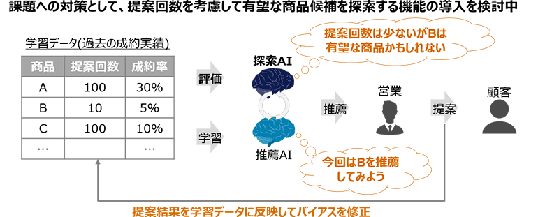 この課題への対策として、提案回数を考慮しながら有望な商品候補を探索する機能の導入を検討しています。有望な商品候補を探索するAIと、売れる商品を推薦するAIを組み合わせて、営業への推薦結果に一定の割合で有望な商品候補を混ぜることで、学習データのバイアスを除去し、更なる成約率向上を目指しています(図5)。