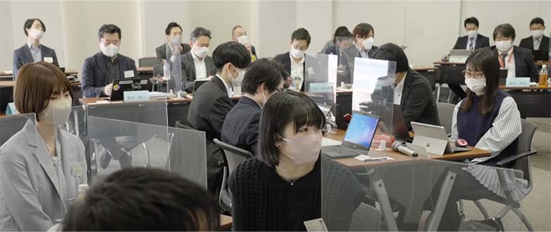 また、受講者が気軽に意見交換できるコミュニティ機能をオンライン上に設け、デジタル活用に関する疑問や悩みを企業の枠を超えて相談できる環境を提供しています。また、6カ月のプログラムの最終段階では、デジタル活用を通じた新しいビジネスアイデアを各チームで考え、プレゼンテーションを互いに評価し合うコンテストを実施しています。