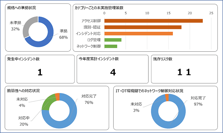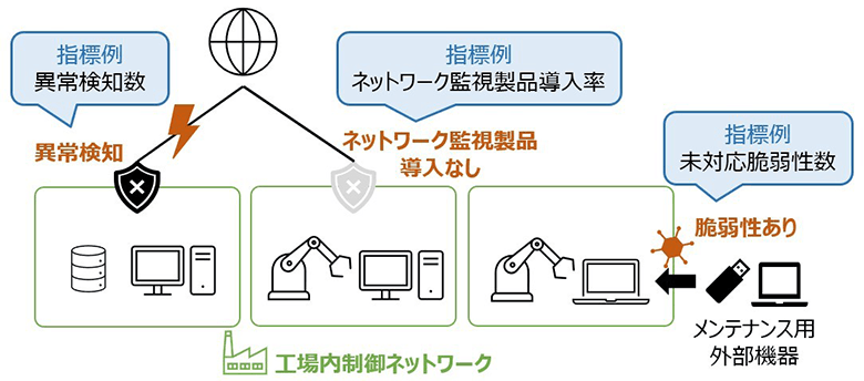 また、工場内のネットワークがインターネットに接続しない閉域である場合であっても、工場内の機器をメンテナンスする際に使用する外部機器からマルウェアに感染するリスクが考えられます。そのようなリスクに対しては、メンテナンス時に利用する外部機器に関して、特定された重大脆弱性の合計数やそのうち未対応である脆弱性の数等を指標として設定することが有効でしょう。