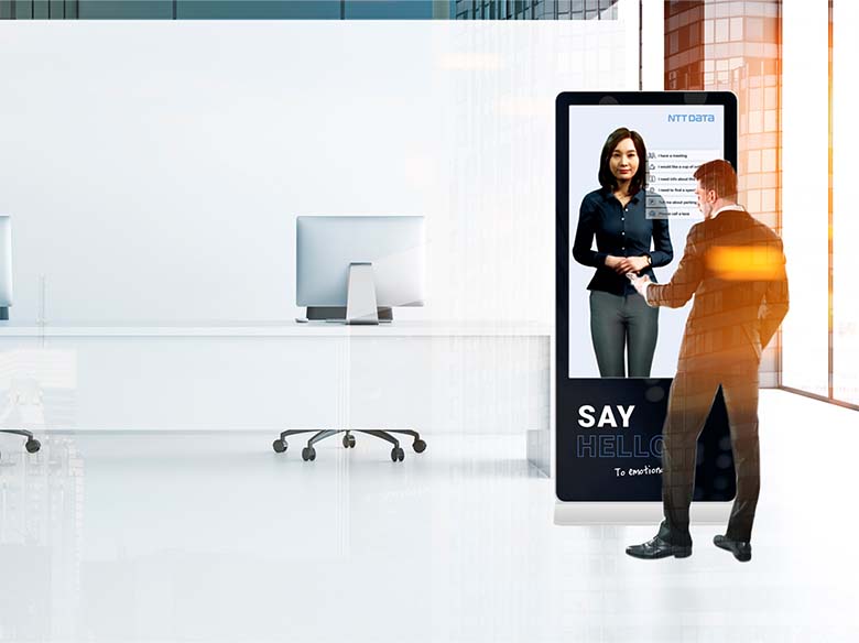 Krifa社が抱えている顧客サービスや人的リソースの活用における課題を見出したNTTデータは、AIを搭載したデジタルヒューマンである「Aida(アイーダ)」を提供。Krifa社の受付にキオスクとして設置しました。これにより、来訪者はチャットボットやタブレット端末といった非人間的なインターフェースに頼ることなく、デジタル受付担当者とシームレスに対話することができるようになりました。