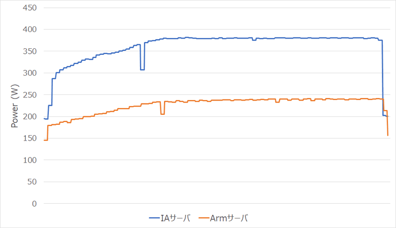 サーバでは主として対象アプリケーションのみが動いている状態にしたため、この消費電力の差は純粋にJavaアプリケーションを各サーバで動作させたときの差とみなせます。試験は15分間実施し、最初の5分間は負荷量を上げるためのランプアップ期間です。グラフ後半の定常状態の消費電力を比較すると、IAサーバが380W、Armサーバが240Wであり、ArmサーバはIAサーバに比べ37%(140W)の消費電力を削減できました。Javaはプログラムをプラットフォームに依存しない中間言語へコンパイルし、それをJVM(Java Virtual Machine:Java仮想マシン)で実行するアーキテクチャです。そのため、IAサーバとArmサーバで動かしたアプリケーションは、ソースコードが同じであるだけでなくバイナリレベルでもまったく同じものです。これはサーバのアーキテクチャを変えるだけでこれだけの消費電力を削減できることを示しています。