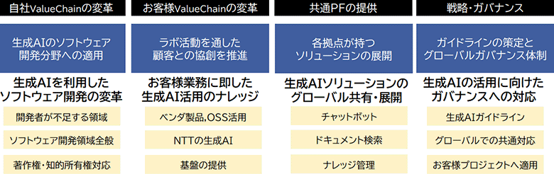 現在NTTデータでは、AI活用によるお客様ビジネスの業務変革を実現するにあたり、前述したリスクを鑑み、「積極的なAI活用の推進」と「AIガバナンスの徹底」の両輪で取り組んでいます。その体制づくりとして、2023年6月には生成AIの活用をグローバルで推進する「Global Generative AI LAB」を設立。本ラボでは4つの柱を軸に活動を行っています。