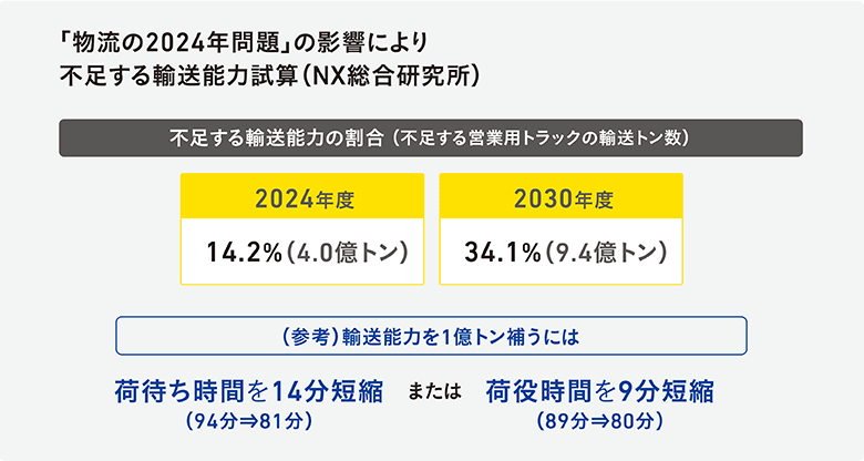 「多様なお客さまと接する中で、もう既に2024年問題は始まっていると感じます。たとえばある工場からある工場へ荷物を運びたい時、これまではどんな場合でも対応できていたのに、急な依頼では対応しきれないというケースなどがしばしば聞かれます。日本には製造業関連事業者がとても多く、これらの事業者をつなぐ物流は言わば日本を支える血流です。その血管が人材不足や過当競争にさらされ、壊死し始めているのです。現状ではモノづくりや卸業のレベルでこうした問題が起き始めているわけですが、徐々に大手製造業、小売事業者、一般消費者などへの影響がどんどん目に見えてくるはずです。ある調査では、2024年に不足する輸送能力の割合が14.2%(2019年度データとの比較)、不足する営業用トラック輸送トン数は4.0億トン(2019年度データとの比較)といった報告まで出され、2030年度には不足する輸送能力が2024年度の倍以上に跳ね上がるという予想もあります。ですからいますぐ業界全体として非効率化解消に向けた取り組みを始めなくてはならないと切実に感じています」