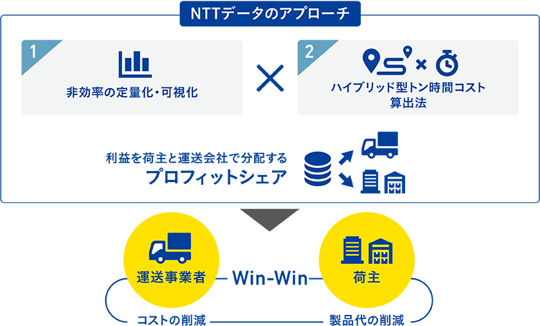 「この状況が蔓延している最大の理由は、物流コストの計算方法にあると考えています。その計算はトンキロ法と呼ばれ、端的に言えばどれだけの重さ(トン)のものをどれだけ遠く(キロ)へ運んだかで料金が決まるのです。ところがこのトンキロ法では、1回の輸送でできるだけ多くの仕事をそのトラックに負わせた方が荷主は得をします。過当競争もあって、立場の弱い運送業者はどんどん仕事が多くなるわけです。そこでNTTデータでは、『重さ』『距離』に加えて『時間』の概念をコスト計算に採り入れることを関連事業者へ提案しているのです。この計算法『ハイブリッド型トン時間コスト算出法』を採用すれば、見積もり段階で走行距離と総運送時間を算出することになり、輸送改善活動で生まれたプロフィットを発荷主、着荷主、運送事業者それぞれがシェアする方向へ構造転換していく入り口となるでしょう。荷待ちや荷役の時間もコストに含まれるため、運送事業者だけでなく荷主側も非効率解消に向けて積極的になり、その結果、原価が下がればそこで生まれた効果を皆でシェアできるというわけです。このような理論で『ハイブリッド型トン時間コスト算出法』を荷主側へも啓蒙し、物流業界を守っていかなければなりません」