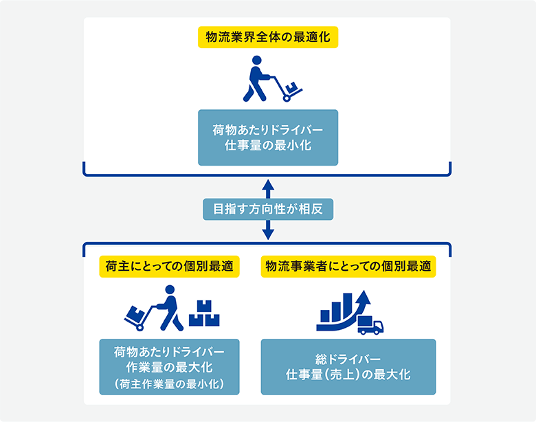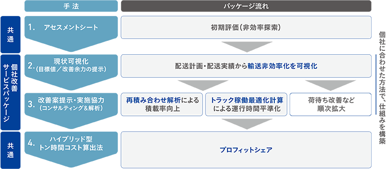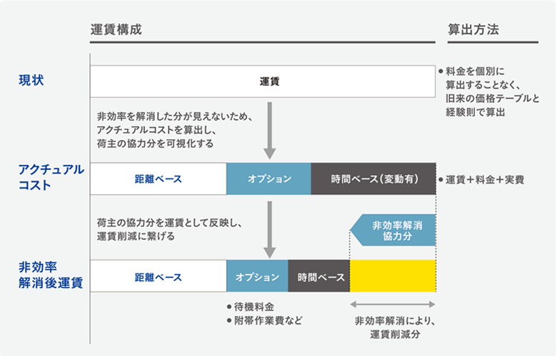 その第一歩に、荷主企業に対する個社改善アプローチとして、アセスメント・コンサルティングサービスを実施しています。運送事業者ではなく荷主企業に働きかけをするのは、大抵の場合非効率の原因は荷主側にあり、荷主の立場の強さによって運送事業者も従わざるを得ないからです。だからこそ、荷主が運送事業者へ強いている状況が自身にとっても損につながることを理解してもらい、荷主企業が主体となって活動に取り組む必要があります。