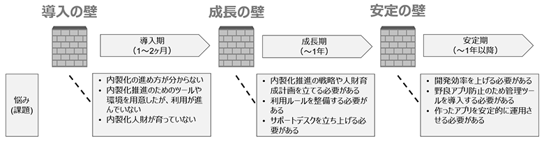 内製化の取り組みが一定組織に普及した「安定期」に重要となのは、ガバナンスと改善・効率化です。アプリケーションが一定数を超えたあたりから、野良アプリ(※2)問題や、セキュリティインシデントが発生しやすくなります。そのため、内製化におけるガイドラインや規約を策定し周知徹底するなど、ガバナンス向上の営みが必要になります。