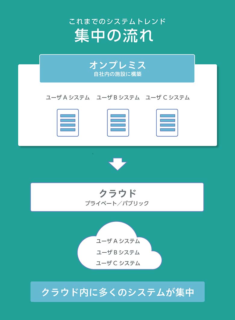 これまで、システム環境はコンピューティングリソースを「集中」させる流れにありました。システム環境を自社の施設に構築するオンプレミスから、自社専用のクラウド環境をサービスとして構築するプライベートクラウドへと移行することで、まずは企業内、組織内における部分的な「集中」が進みました。