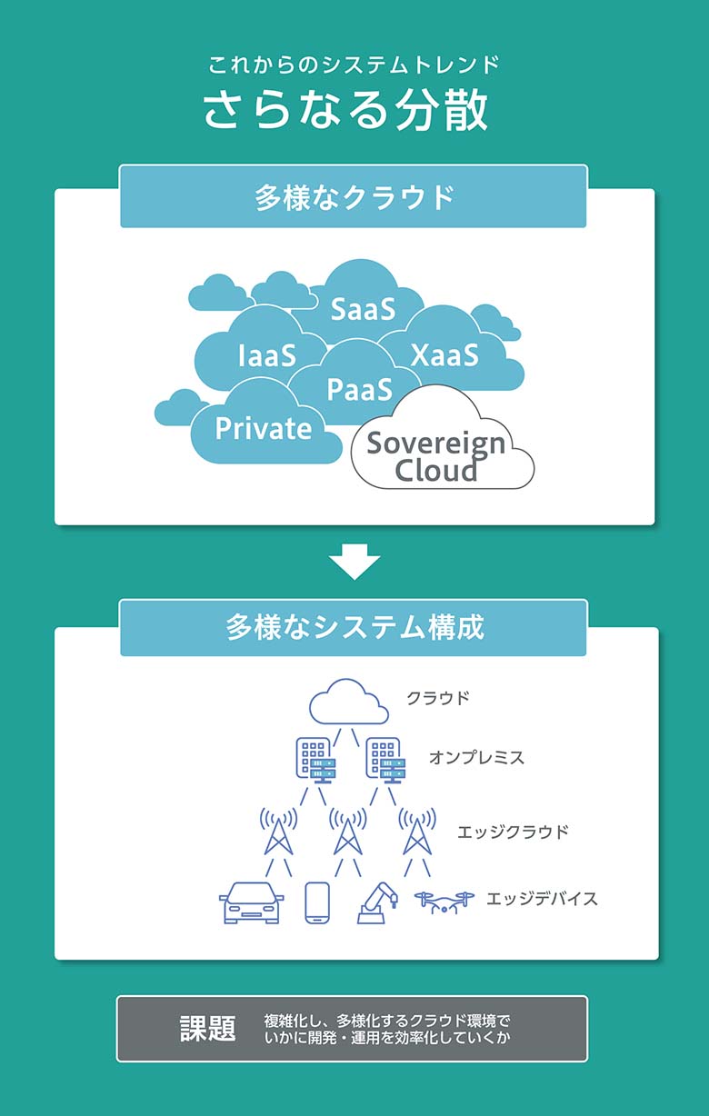 さらに、国際情勢の不安定化を背景に、データ・システム・運用の主権や法的要件を満たすソブリンクラウドの利用も増加するなど、システム構成は多様化の一途を辿っていくことでしょう。このようなシステムのトレンドから今後の傾向を見据えると、要件に応じて複数のクラウドシステムを組み合わせるハイブリッドクラウドが一般化していくと考えられています。