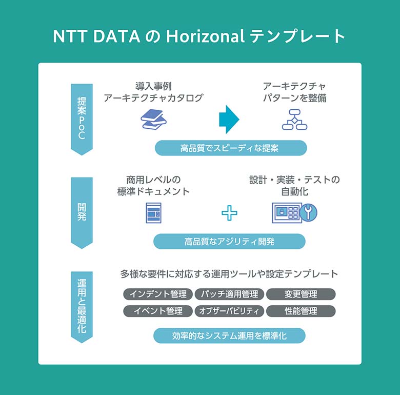 NTT DATAでは、このような豊富なアセットをベースに既存システムをカスタマイズしたりサービスを組み合わせたりすることで、お客さまの開発・運用を効率化し、コアビジネスに注力できるシステム環境を構築していきます。