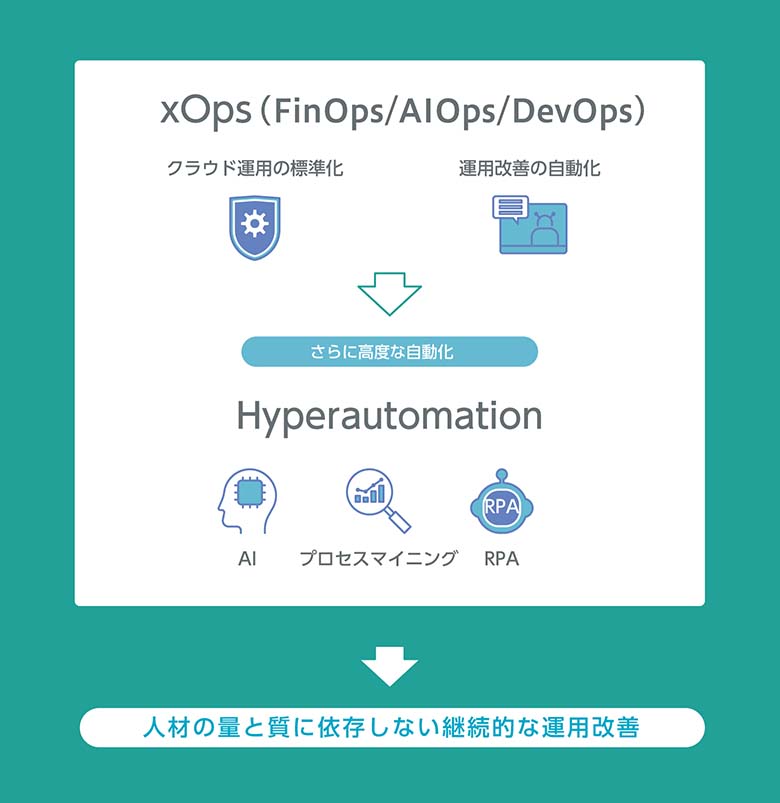 これからクラウドの市場が成長していく一方、クラウド運用に必要な人材は不足していきます。さらに、システムが複雑化するにも関わらず、更新も頻繁になるため、これまで以上に人手とコストがかかるようになります。NTT DATAでは、クラウド運用の標準化、運用改善の自動化ができる「xOps」、AI、プロセスマイニング、RPAなどによるさらに高度な運用自動化である「Hyperautomation」によって、人材の量や質に依存しない継続的な運用改善を実現します。お客さまがコアビジネスに専念することをサポートする技術アセットです。