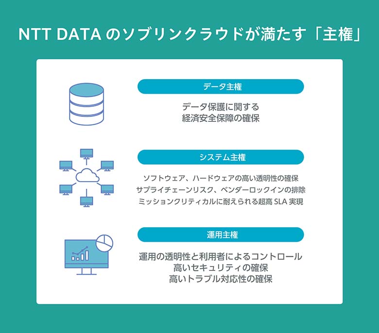 公共・金融分野のミッションクリティカルシステムにおけるクラウド活用においては、経済安全保障と透明性確保が課題となっています。このような高い機密性や保守性が求められるシステムに、データ、システム、運用の主権を確保することで対応するクラウド基盤が「ソブリンクラウド」です。NTT DATAのソブリンクラウドは、以下の図に示す要件を満たし、NTT DATAまたはお客さま自らがコントロール可能なクラウド基盤を実現する技術アセットです。