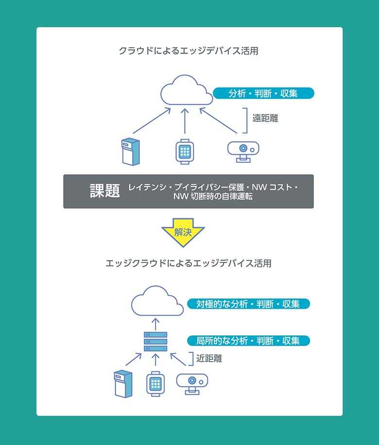また、クラウドが一時的にコンピューティングリソースを集中させたことは、「データ転送による通信遅延」「大量データのリアルタイム処理」「機密情報のセキュリティ確保」といった課題を生み出しました。このような課題に対し、利用者や端末に近い場所へ処理装置を配置するエッジコンピューティングは「レイテンシーの削減」「データのリアルタイム処理」「機密情報の匿名化によるセキュリティ確保」を実現する技術として近年注目を集めています。