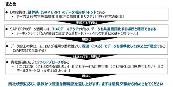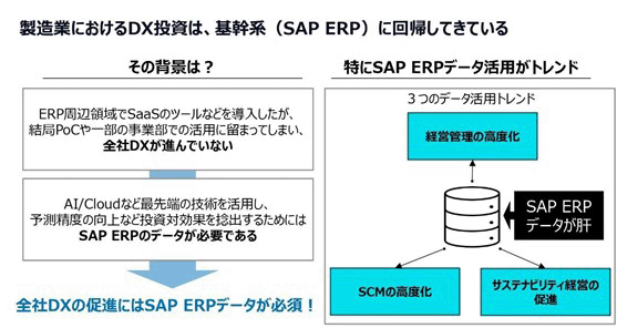 全社で統一されている場合は問題ありませんが、そうでない場合は基幹システムが、データ活用に向けて大きな障壁となることも考えられます。事業所単位から全社単位でのDXをめざし、積み上げてきたデータを活用するためには、SAP ERPのデータが必須となるのです。