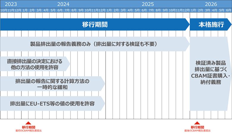 CBAMは、2023年10月~2025年末までを移行期間とし、2026年から本格的に開始されます。