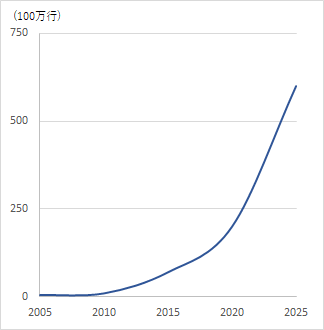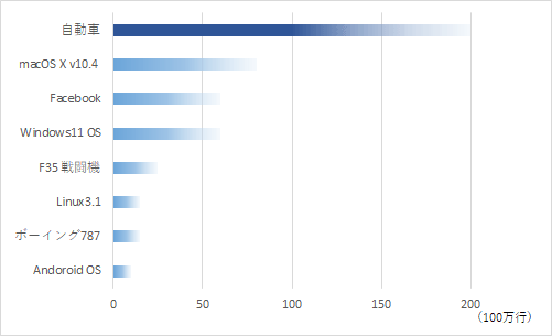 CASE(※1)実現に向けてコネクテッド機能や自動運転機能などが搭載され、自動車の概念が大きく変化しています。新機能実現のために、AI関連企業などが次々とソフトウェア開発に参画しており、サプライチェーンの複雑化は避けられません。また、自動車に搭載されるECU(電子制御ユニット)は、2021年には自動車1台当たり平均29.6個であったものが、2035年には46.6個に達すると予測されています(※2)。それに伴い、ソフトウェアのコード行数も急激に増加し、2020年には自動車1台当たり2億行、2025年には6億行に達すると推測され(※3)、これは他分野のソフトウェアを凌駕した大きさです。(図1、2)