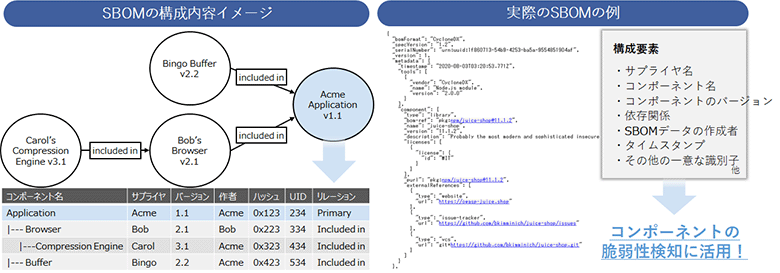 図3:SBOMの概念的イメージと実際のSBOMの例(※10)