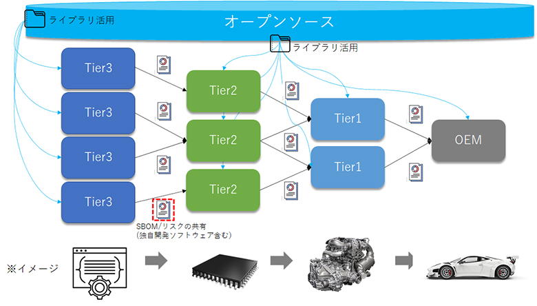 車両におけるSBOM作成の対象範囲は組込みシステム、リアルタイムOSや各車両機能に固有の独自ソフトウェアコンポーネントなど多岐にわたります。OEM(※10)がSBOM作成をする理想的な方法は、各サプライヤーがSBOMを作成し連携することです。これは、自動車業界においてはOEMやTier1(※11)が直接ソフトウェアコンポーネントを開発するケースは少なく、その多くはTier2(※12)やTier3(※13)によって開発されているためです。(図4)