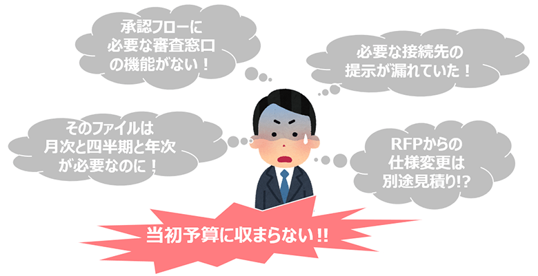 また、どうしても「ベンダの想定」が多ければ多いほど、システムへの要求に関する認識齟齬が起きやすくなります。当然提案後にもお客さまと議論を重ね要望をお伺いすることにはなりますが、結果として「要件定義が終了してみたら想定以上に規模が膨らみ予算上限に収まらない」といったことが起こりやすくなります。