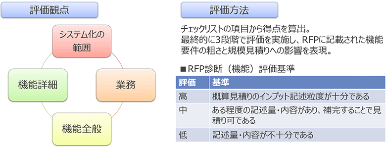 NTTDATAにはこのRFPの記述内容や記述量、記述粒度などを診断する『RFP診断』というサービスがあります。RFPがベンダの見積もりにあたって十分かを評価するための診断です。RFPに記述された機能要件、非機能要件およびプロジェクト管理要件に対して診断します。