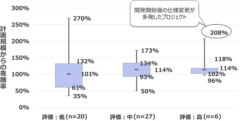 RFP診断の評価別(高・中・低)に、計画規模を100とした場合の実績規模の乖離幅(%)を箱ひげ図で示します。