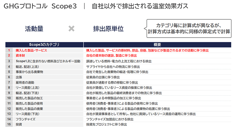 まず、Scope3カテゴリ1・2の排出量を可視化する必要がある。そのための一般的な手法は、産業連関表ベースの排出原単位を用いている。産業連関表は国内産業間の取引関係を示す統計で、関係政府機関が合同で5年に一度作成される。この統計をもとにした製品・サービスごとの排出原単位を、各企業の活動量と掛け合わせて排出量を算定する。