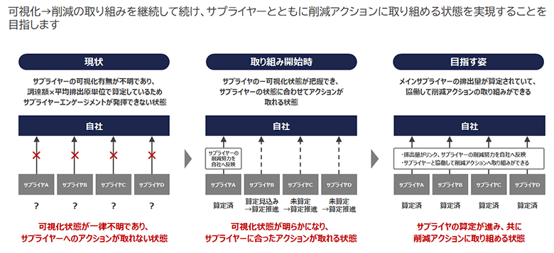 ただ、構築したつながりを生かして実質的な削減につなげるには粘り強い取り組みが必要だ。顧客という立場で、Scope3カテゴリ1・2の排出量算定をサプライヤーに強いることはできない。カーボンニュートラルの意義を説明しつつ、お願いし続けるほかない。