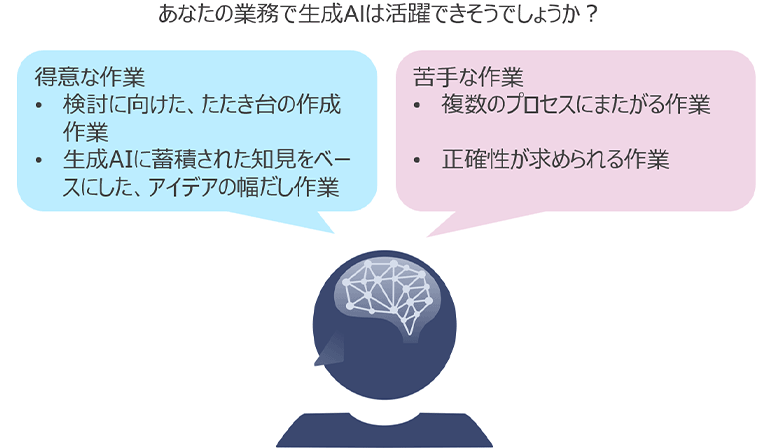 上記を踏まえ、生成AIが自分の抱える業務の役に立つかを考える必要があります。皆さんの業務に照らし合わせてみるといかがでしょうか?