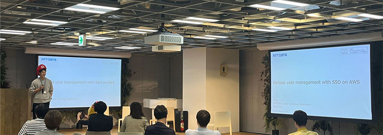 議論後には、立食形式でのネットワーキングイベントを開催しました。このイベントでは、参加者のAWS Japan AmbassadorやJr Championsの有志がなんと15人も英語でライトニングトークしました。NTTデータからも若手のJr Championsが初めての英語プレゼンテーションにチャレンジし、グローバルイベントの経験を獲得するとともに、海外メンバーとのリレーションを構築するよい機会になりました。