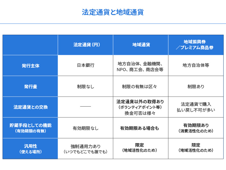地域通貨とは、特定の地域やコミュニティで利用することを目的とした通貨のことを指します。日本の法定通貨である「円」が、日本銀行が独占的に発行する法律により認められた通貨であるのに対して、地域通貨は国家や中央銀行以外の自治体や企業などが独自に発行する通貨です。また、使用できる場所が地域に限定されており、バリューやポイントに有効期限が設定されていることが多いのも地域通貨の特徴です。