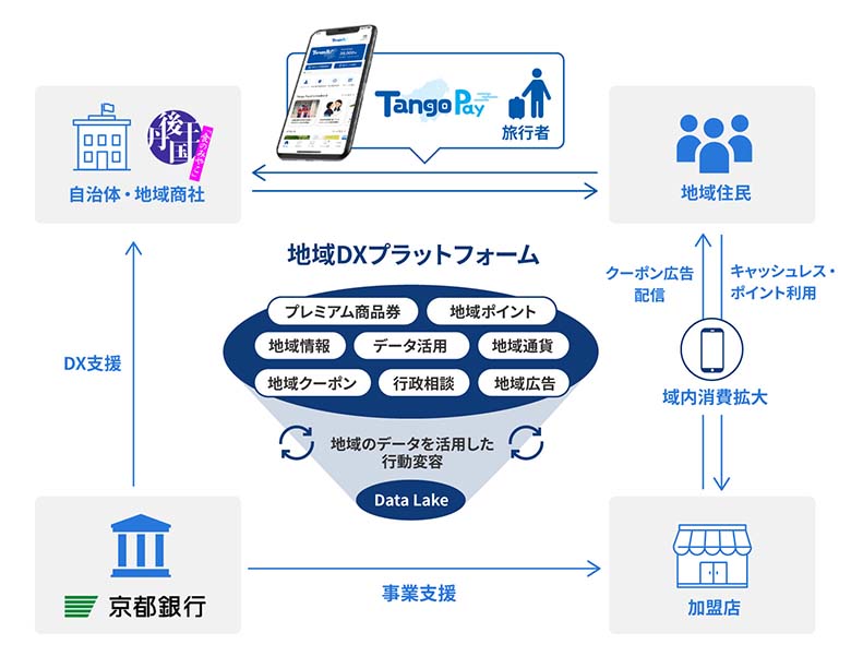 寺社仏閣が立ち並び観光地として賑わう京都市街地に対して、北部にある丹後地域では観光客誘致に課題を抱えています。Tango payは丹後地域の道の駅やホテルなどさまざまな店舗や施設で利用できる地域通貨です。スマートフォンアプリから観光情報や割引特典などを提供することで、観光客に対してマーケティングの実施と利便性向上を図ろうとしています。
