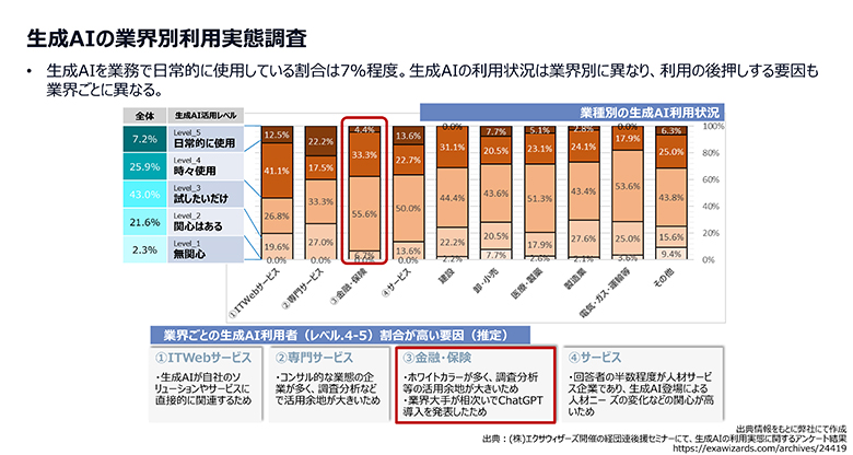 上述したとおり、金融・保険業界はかなり生成AIに関心を寄せています。ドキュメントやメールなど、文章を書く業務が多いほど、ChatGPTで代替できる可能性があると考えられているようです。