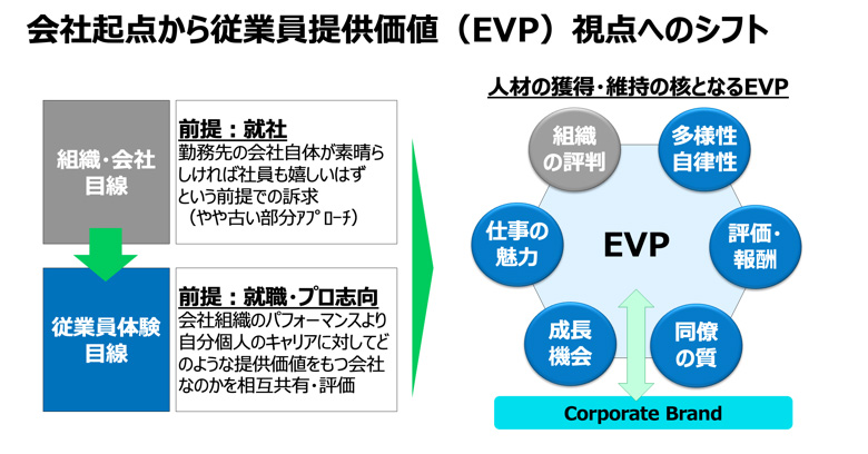 こうした状況下で専門人材を確保するためには、企業目線ではなく働き手や従業員体験(EX)目線のアプローチで「この会社で働くことにどんな価値があるのか」というメッセージを伝えていかなければならない。仕事の魅力、成長機会、多様性等の従業員提供価値をしっかりと定義して、アピールすることが大切だ。この価値訴求は必ずしもすべての要素で満点を取る必要はなく自社ならではの磨き込みが必要となる。日本企業においては多くの場合、初任給等の報酬を中心とした訴求や組織自体のパフォーマンスが中心になりがちではあるが、冒頭の事例A社においては処遇レベルは程々だが仕事で取り扱うデータの中身やサービスの社会価値等の訴求で大手デジタル企業と人材獲得で競合するレベルを実現した。小手先や入口だけではない選ばれるための従業員体験全体をどう磨くのか、という視点でのアプローチによって差が出る事を認識する事が重要だ。