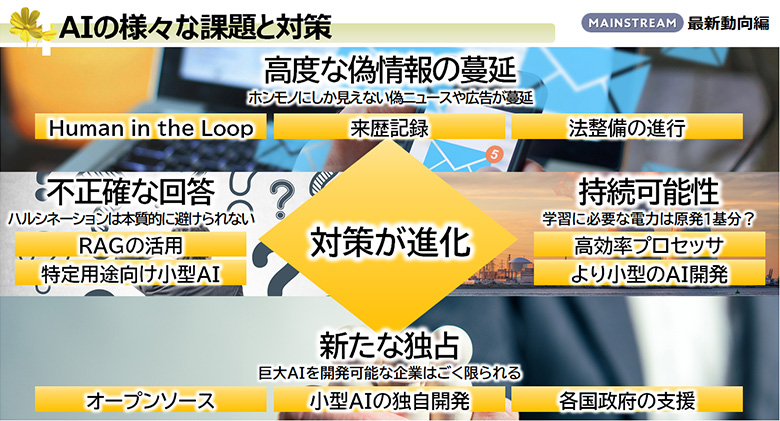 AIによる「不正確な回答(ハルシネーション)」にはどのような対策が進められているのか。AIが何かを生成するときに意味や文脈を考えず、言葉を記号として扱っている以上、こうした課題は避けられない。