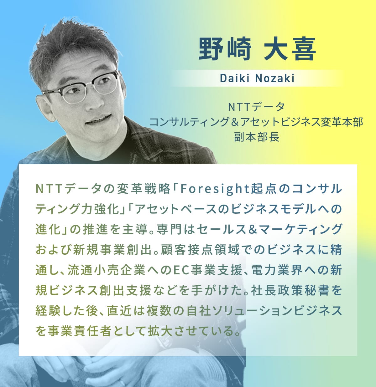 顧客から見るとNTTデータという会社はあくまで「システム開発の会社」であり、経営に一歩踏み込み、事業の成長を一緒に考えるパートナーとは認識されていませんでした。野崎という一個人がどれだけ真剣にこの事業の未来を考えても、会社としてパートナーと認識されない限り具体的な提案や協業には至らない――その時に感じた悔しさが、今の私の原体験になっています。