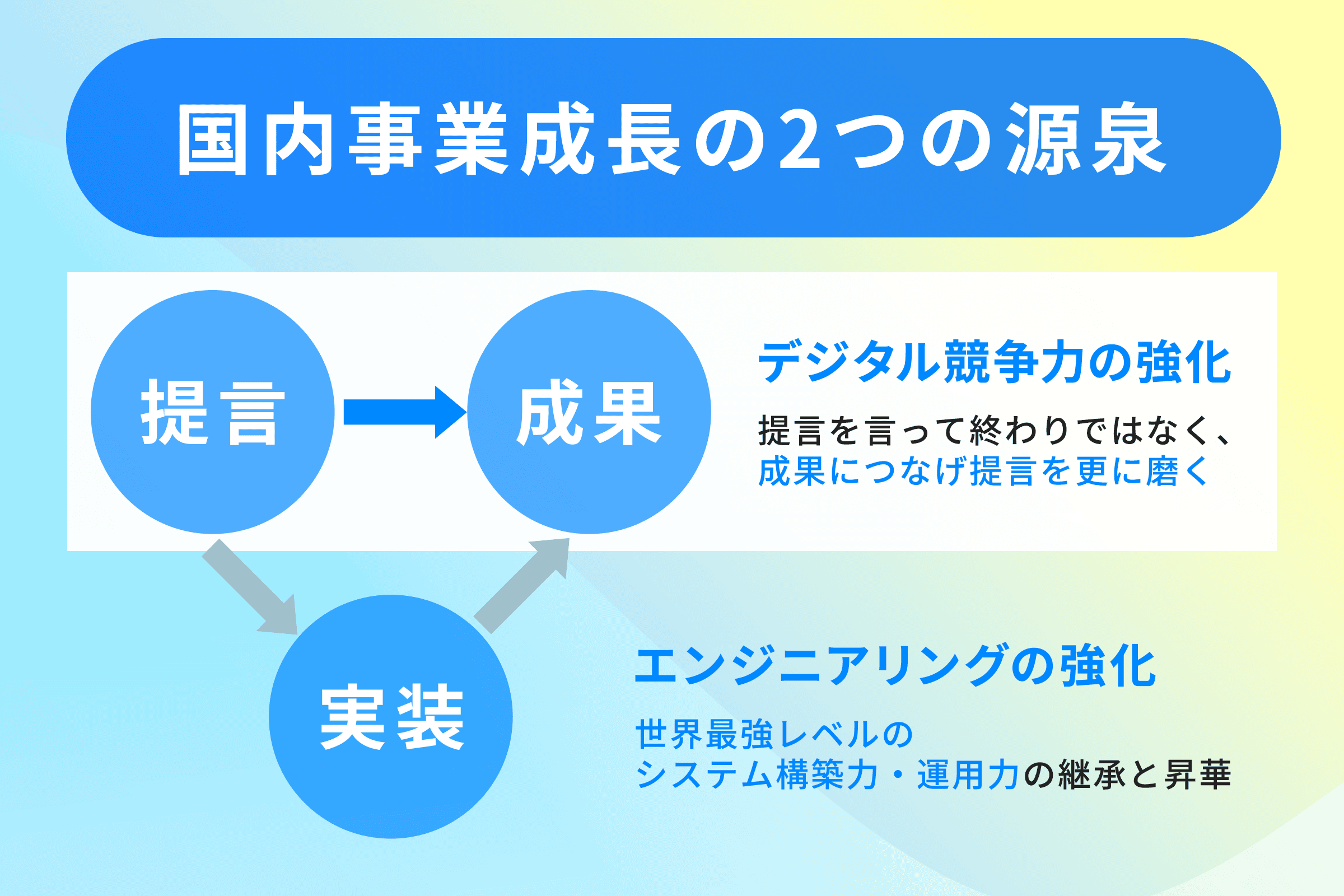 野崎:IT自体はコモディティ化している一方で、コモディティ化しているものを組み合わせる技術は高度化しているのが現代です。「提言・実装・成果」の言葉に沿ってお話すると、深い業界や業務への知識とテクノロジーへの知見をもとに「提言」したうえで、高いレベルで「実装」までやり切り、しっかり「成果」の創出まで伴走する姿勢は強みになりえると思います。