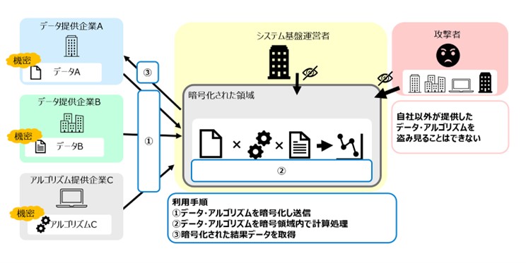 NTT DATAの秘匿処理技術では、データ提供企業が活用するデータを暗号化し、システム基盤上の暗号化された領域内に送信します(図2(1))。この暗号化された領域内で、各企業が提供したデータが使用されて計算処理が行われます(図2(2))。その後、計算処理の結果は再び暗号化され、出力されます(図2(3))。これにより、データ提供から結果の受け取るまでの全てのタイミングでデータが保護された状態を保つことができます。