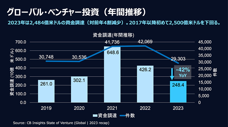「グローバルにおけるベンチャー投資の状況を見ると、2023年には資金調達の規模がおよそ36兆円。これは前年比約40%の減少であり、2021年からの減少トレンドが続いていると言えます。同時にユニコーン企業の誕生についても減少トレンドが鮮明です。一方で、特定のテーマには投資が集中している傾向も見逃せません。SDGs関連、クリーンテック関連、そして生成AI関連への投資は堅調と言え、多様なイノベーションへの期待も高まっているのです」
