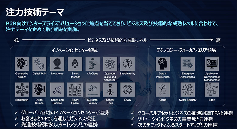 「2022年の実績ではベンチャーへの投資額が約8774億円と過去最高を記録し、一件あたりの投資額も大型化がひとつのトレンドとなっています。また、日本政府は一昨年、スタートアップ創出元年を宣言し、ベンチャー企業への投資を重点施策と位置づけ、5カ年計画に基づき一兆円を超える予算措置を講じるなど、スタートアップ育成の土壌は整いつつあります。このような環境において、NTT DATAは生成AIなどの成長分野に注目しつつ、新たなテクノロジー分野においてスタートアップ企業との連携を一層、深めようと注力しています」