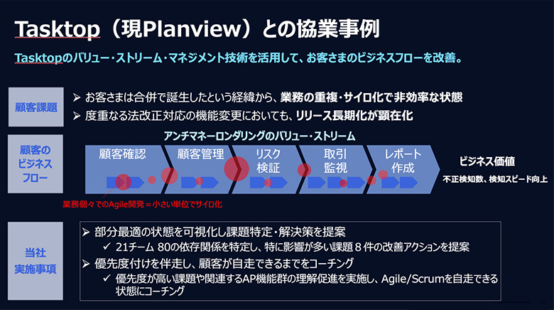 「たとえば協業を開始した米国のTasktop社(現・Planview社)は、お客さまのアンチマネーロンダリングに関わるソフトウェア開発を実施する企業です。協業によって、開発プロセスフローの課題を明確にし、製品のリリースが長期化してしまう状況を改善することに成功しました。米国事業会社での技術検証などを経て、現在では大手金融機関からの受注も実現しています」