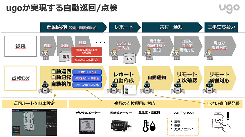 ugo社のロボットソリューションはすでにオフィスビルや商業施設の警備業務、データセンター、発電所、医療介護施設などの保守管理といった領域で活用されています。たとえば従来は設備点検やその運営管理においては、人間の五感や経験に依存したスタイルが主流でした。ところがロボットが常駐することで、異常検知やその警告、管理レポートの作成までを自動化し、ロボットと協働するワークスタイルを実現しています。