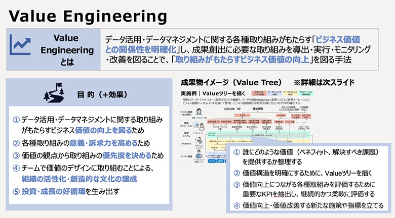 村山は「データ活用、データマネジメントは、さまざまなメンバーが絡んでおり、非常に複雑。その構造を見える化して、KPIを定義し定量的に評価するための取り組みがバリューエンジニアリングです」と語る。概要は、以下の図表に記しているが、最大のポイントは『バリューツリー』を描くこと。