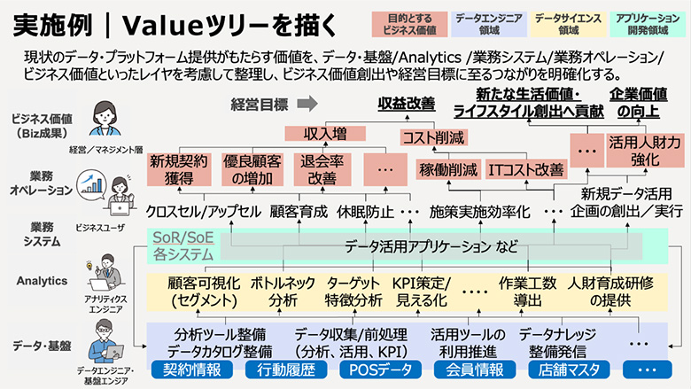 バリューツリーとは、データ・基盤/Analytics/業務システム/業務オペレーション/ビジネス価値といったレイヤーを整理して、ビジネス価値創出や経営目標に至るつながりを明確化したもの。それによって、経営層からビジネス部門、データを提供する各部署、データを加工するデータエンジニア、そして、データ分析を行うアナリティクスエンジニアまで、すべての組織において横断的な取り組みを可能にする。