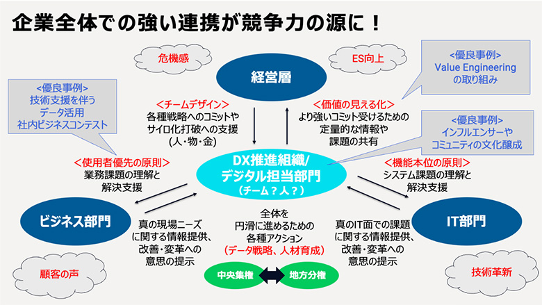 では、実際にデータ活用がうまくいっている企業では、どのような心構えで取り組みを行っているのだろうか。本村は自らのお客さまのなかで、「攻めの情報システム部」を実現している企業の考え方を紹介した。このお客さまは、「ビジネス部門がやりたいことは、企業のビジネスを盛り上げること。情報システム部やIT部門、DX推進部門が足かせになってはいけない」という目線で取り組んでいるとのこと。学ぶべきは、2点。全ての部門が同じデータを見ること。そして、技術革新に適応することである。