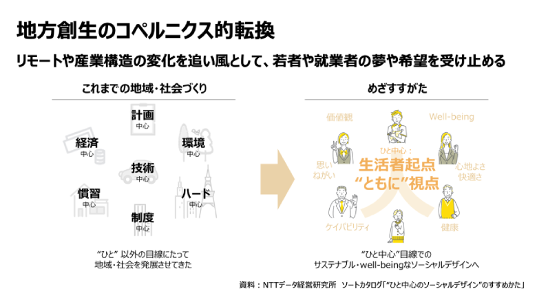 また、NTTデータグループは地域の商社や人材会社と連携し、佐渡発のコンサルティング人材育成プロジェクト「エシカルファクトリープロジェクト」にも取り組んでいる。地域に若者が働きたい仕事、職場を生み出して行くことで、人の流れを変えることができる。地域の活性化にもつながっていくはずだ。