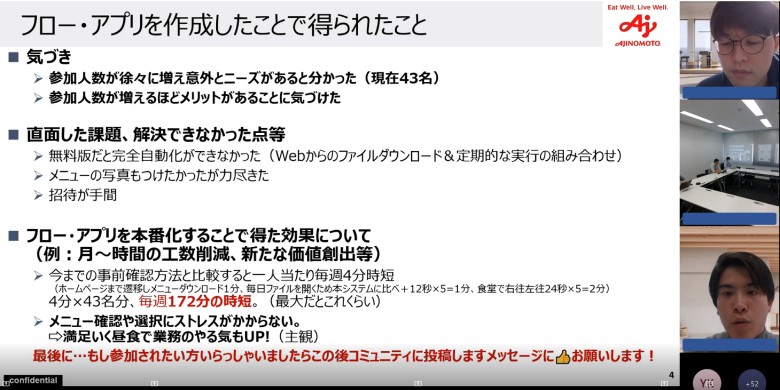 味の素:廣松氏当社には「新しいことにも積極的にチャレンジしていく文化」があります。これからコミュニティをさらに拡大させ、味の素社全社員が自律的に市民開発に取り組む組織文化まで昇華させたいと考えています。