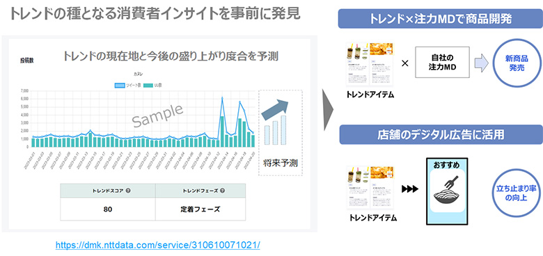 1つ目が、サービストレンドの種となる消費者インサイトを発見する「トレンドエクスプローラー™」というサービスです。現在、多様化する一方の消費者の嗜好性を捉え、さらに対応していくことには膨大な作業が発生しています。特に、企画構想、生産計画、開発というリードタイムが発生する商品開発などにおいては、市場に投下する時にはすでにトレンドが移り変わっていることも少なくありません。トレンドエクスプローラーは、SNSにおける大量の書き込みなどを分析し、トレンドが一過性のものなのか、拡大定着していくものなのかを予測。トレンドが起きる前の段階で種となる消費者インサイトを発見し、データドリブンの根拠を持ちながら商品開発やマーケティングに生かしていくことができます。