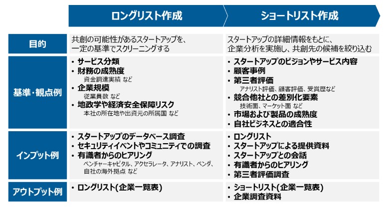 ショートリストとは、ロングリストに残ったスタートアップを分析し、総合的な観点で絞り込んだ企業リストのことです。ショートリストを作成する際は、スタートアップのビジョンやサービス内容、顧客事例、第三者評価、競合他社との差別化要素、市場や製品の成熟度、自社ビジネスとの適合性などを踏まえ、総合的に判断します(図3)。