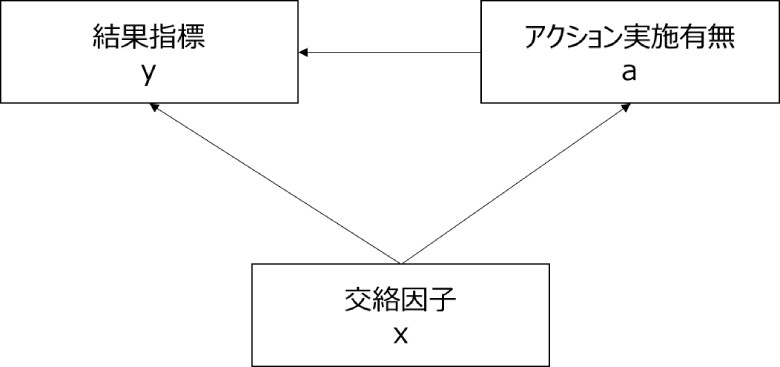 結果指標とアクション実施有無の双方に影響を与える変数がx以外に存在しないことが、傾向スコアを用いて効果検証できるための理論的な前提条件であるため