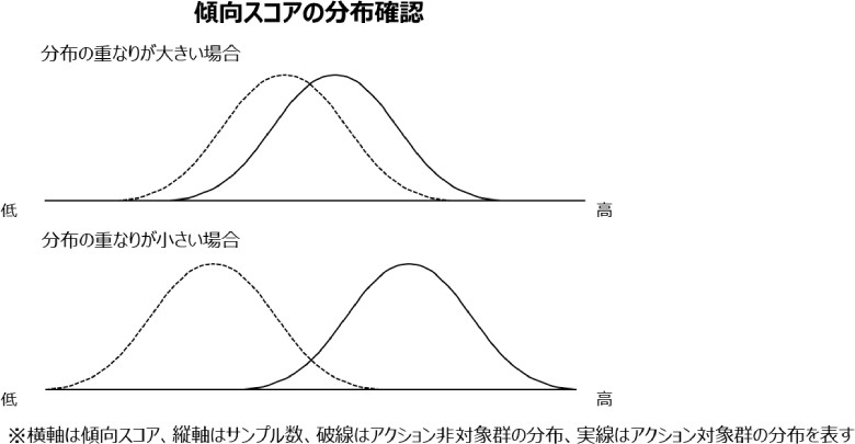 アクションの対象群、非対象群の傾向スコアの分布を比較します。両者の分布の重なりが大きい場合は問題ないのですが、両者の分布の重なりが小さい場合は性質の異なる群を無理やり比較することになるため分析継続可否を含めて検討・判断が必要です。